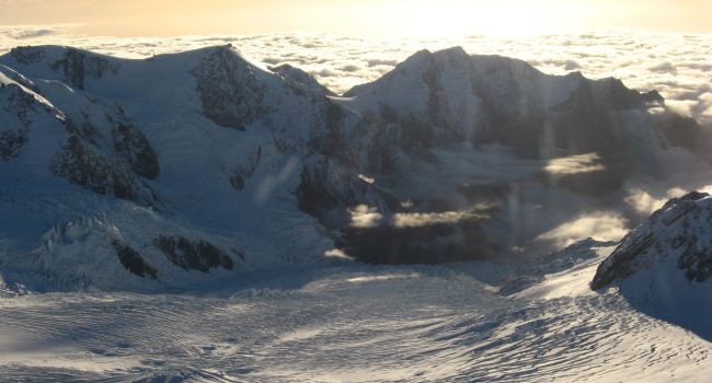 At 16km’s in length, the Murchison Glacier is New Zealand’s second longest. It flows in parallel valleys the Tasman and Murchison Glaciers are separated by the Malte Brun range. This range is dominated by Mt Malte Brun 3170m (10,400 ft).