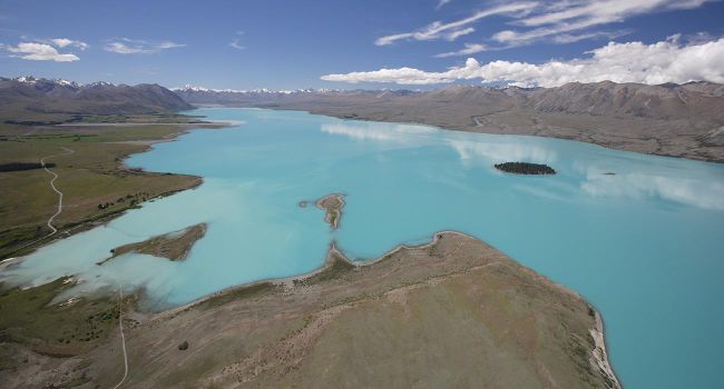 Lake Tekapo covers the first part of your Air Safaris Grand Traverse. Glaciers grinding against rock produce a fine powder called “rock flour”. When washed into the lake this is what produces the stunning turquoise colour. Lake Tekapo is 120m deep and has an average temperature of 7 degrees C. In the summer months it is popular for boating, water sports and trout and salmon fishing.